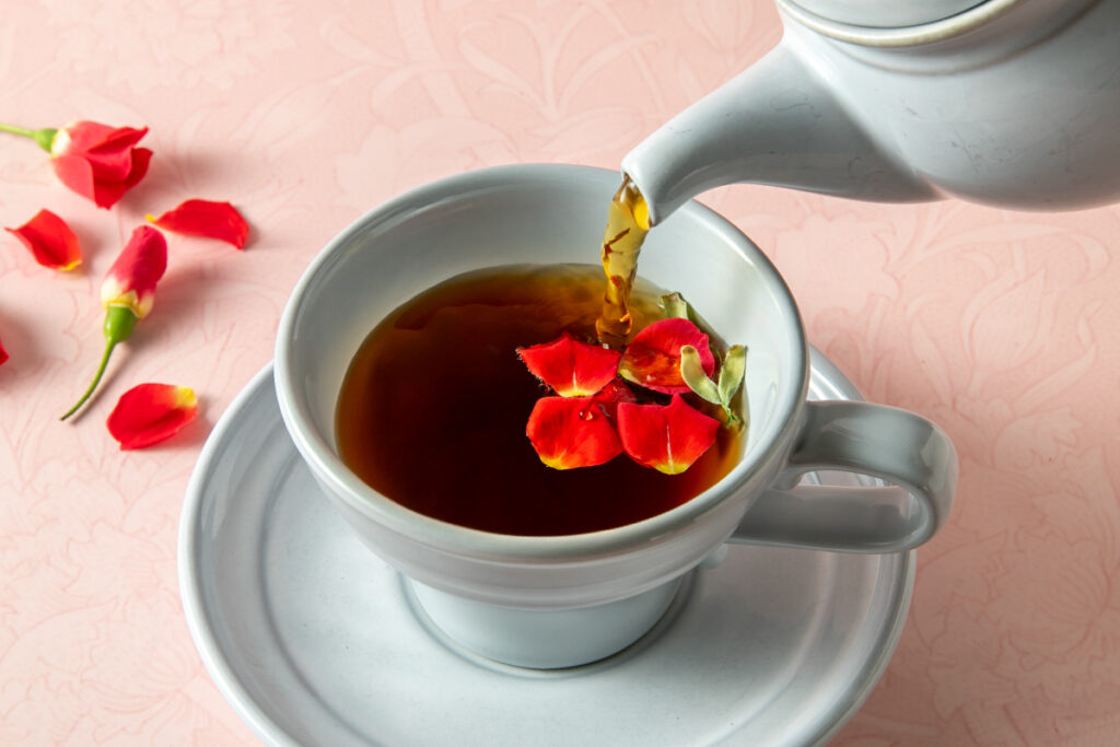 ローズ薫る紅茶にバラとハチミツを合わせた温かいフルーツティー