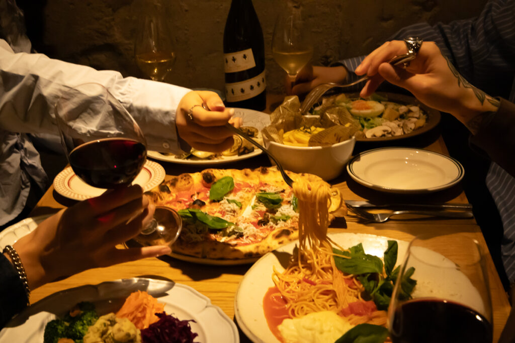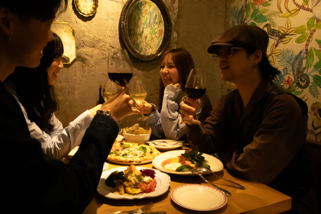 気心知れた仲間とテーブルを囲み、料理をシェアしながらグラスを重ねる時間。肩ひじ張らずに過ごせる空間で、自然と会話がほどけていきます。