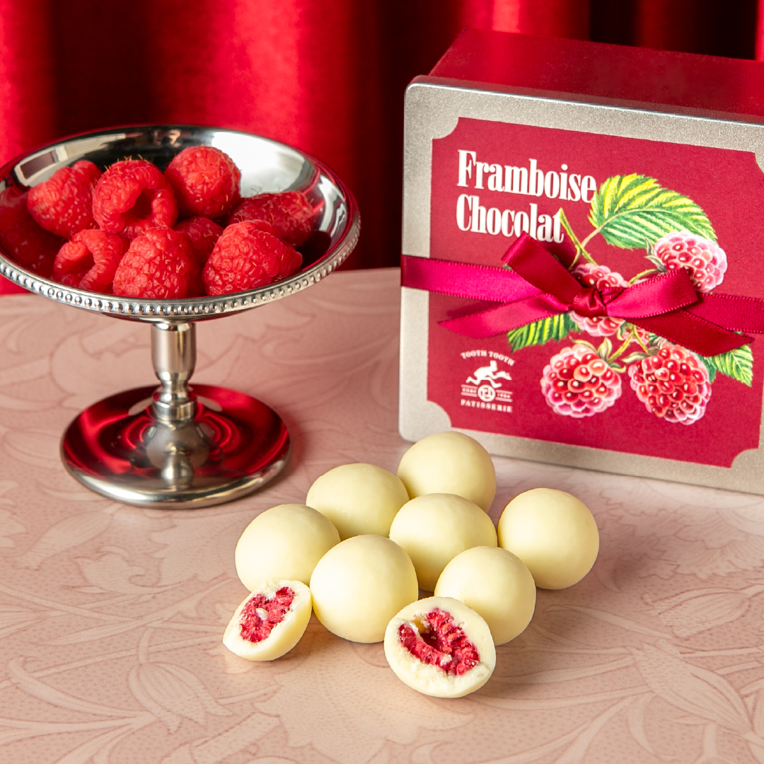 甘酸っぱいフランボワーズを丸ごと、ホワイトチョコレートで包みました。