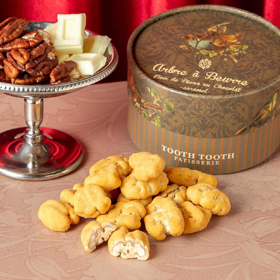 ローストした香ばしいペカンナッツをホワイトチョコとキャラメルパウダーで包み込みました。