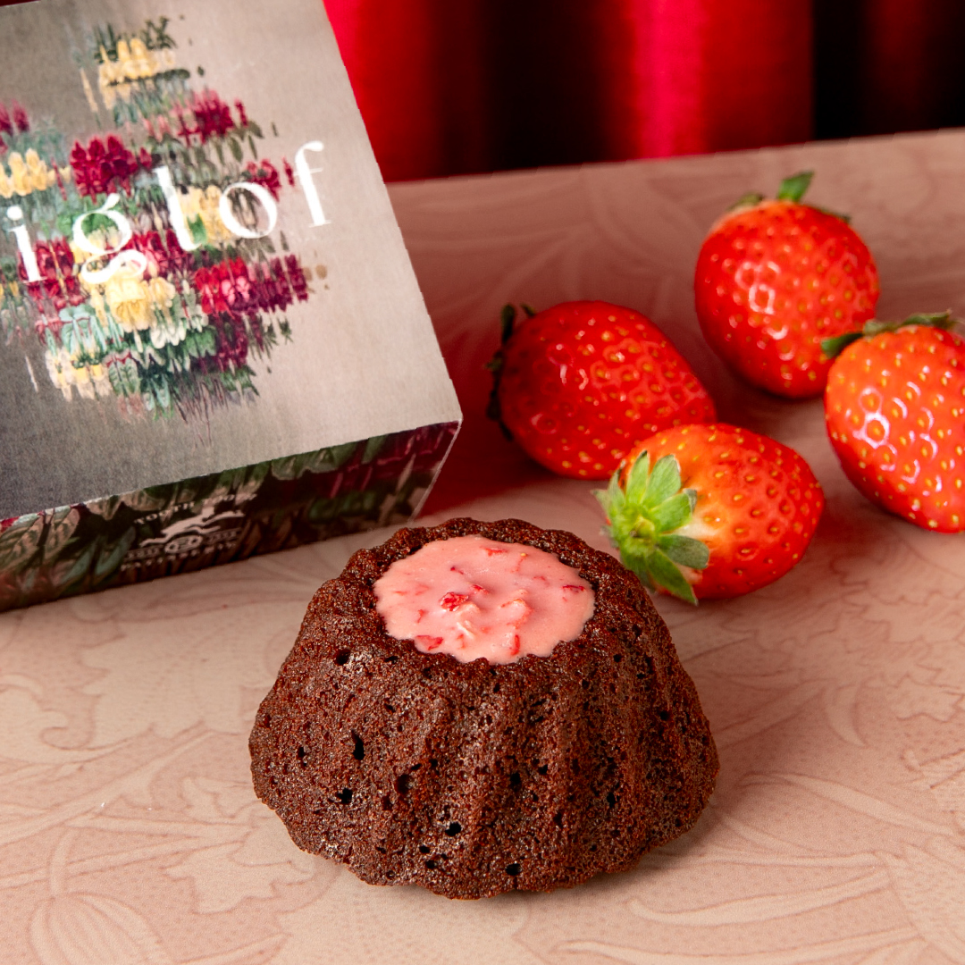 チョコチップ入りのフィナンシェショコラをクグロフ型で焼き上げて、いちごのチョコレートを流し込みました。